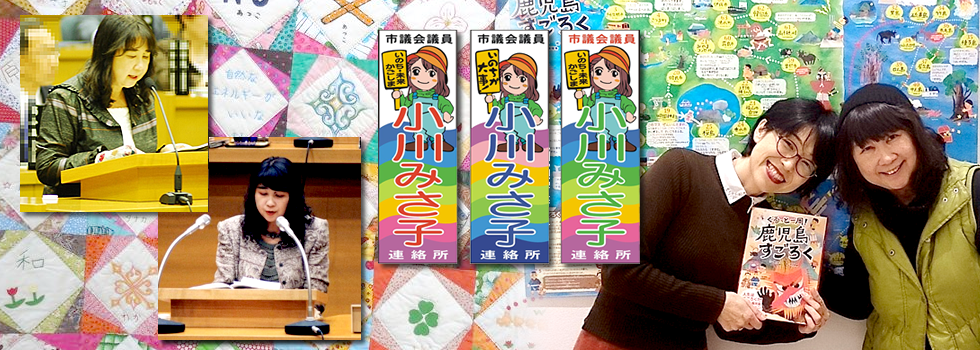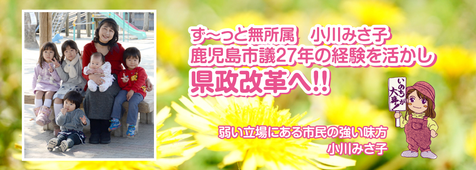 無所属だから見える感じる、わくわくどきどきの世界へようこそ☆彡 弱い立場にある市民の強い味方 小川みさ子 無所属・市民派・環境派・お金より命の女性パワー 市民相談を承ります!! ホームレス(野宿)生活者支援 、子ども医療費窓口完全無料化、福祉オンブズマン 母子父子(ひとり親)家庭 ・ 独居高齢者 ・ 障がい者支援 、議員とおカネ透明化 人工島いらない 、憲法9条守ろう 、戦争法廃止、消費税増税反対、格差是正 がん患者さんサポート 、発酵食品&自然食料理 、情報誌編集、映画上映企画 遺伝子組み換え ・ 環境ホルモン ・ ダイオキシン ・ 添加物 ・ 農薬 ・TPP反対 脱原発、エネルギーシフト 、有機無農薬野菜提携運動 、グリーンコープ生協活動 再稼働反対!、太陽光 &水力 &風力発電 、LED & コ-ジェネ応援、 脱被ばく 石けん利用運動 、子どもの権利条約 、 学校給食自校方式の維持 、子育て支援 自転車は地球を救う 、地域通貨 、フェミニストカウンセリング、DV被害支援 小川みさ子のFacebookページ 鹿児島市議会議員小川みさ子の日々 お知らせ 2023.08.25 💖原発20年延長について考える学習会💖を開催いたします 2020.02.10 ホームページのリニューアルを行っております 2016.04.10 掲示板過去ログを追加掲載しています 2016.04.09 小川みさ子の通信簿2016年版を掲載しました 2016.03.17 「議員とお金〜市民と税金 Q&A」のページを更新しました 掲示板過去ログ 2022年8月1日、レンタル掲示板サービス終了につき、掲示板を閉鎖しました。過去のログはこちらからご覧いただけます。 日記管理用 ページ上部へ戻る